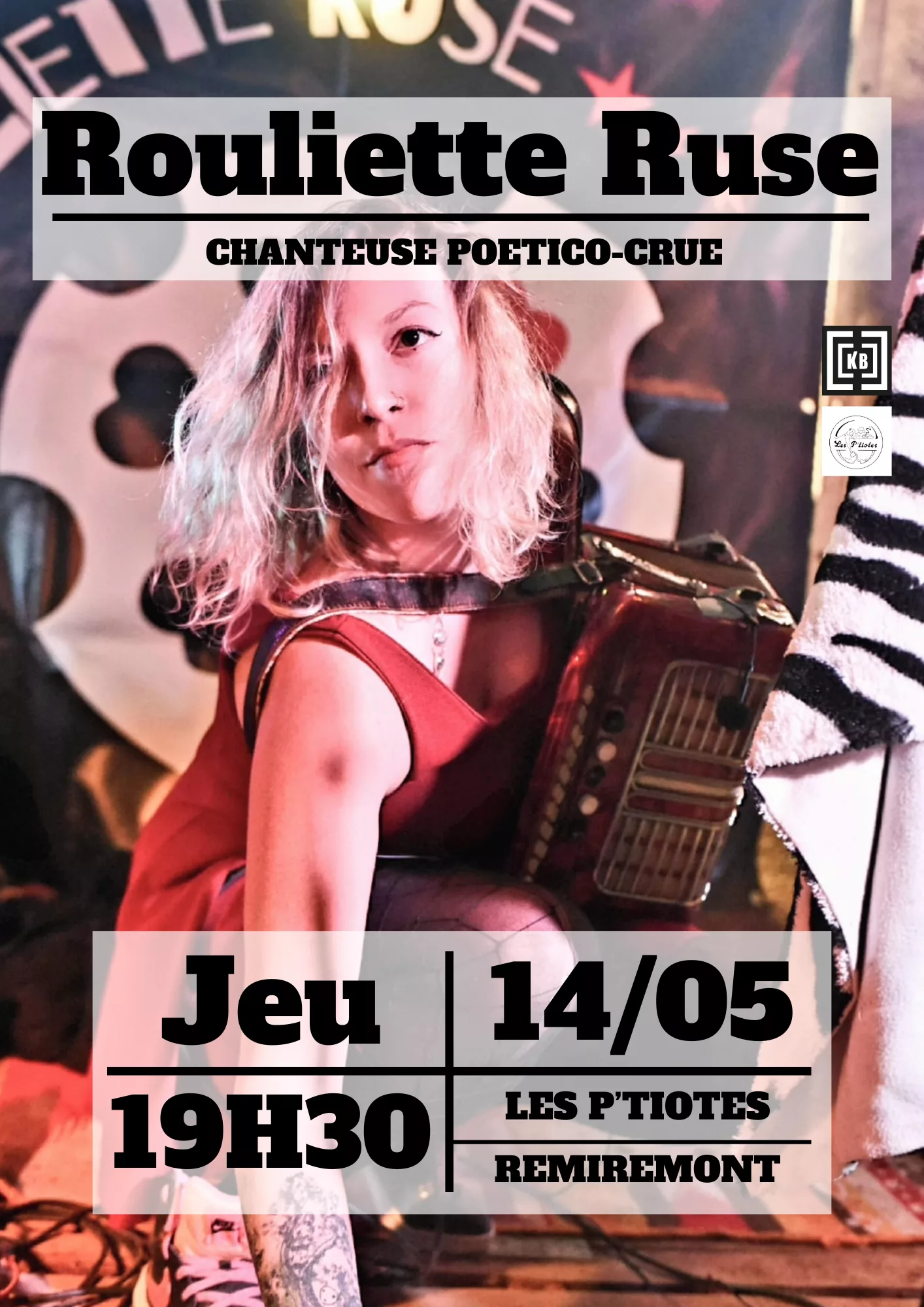 Rouliette Ruse c’est des chansons poético‑crues, mêlant textes directs et sensibilité musicale pour raconter avec humour, provocation et tendresse. Sur scène, elle se produit accompagnée de guitare, accordéon, boîte à rythmes et looper, créant une ambiance acoustique ou électronique où sa plume incisive et ses mélodies surprenantes invitent à l’écoute et à la réflexion. Son univers singulier allie chanson à texte, rébellion poétique et performances intimes, entre introspection et satire sociale.